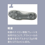 鞋面採用柔軟的人造皮革“Nano Fit Skin”,實現出色的合腳性。大底採用尼龍樹脂材質,重量輕且回彈性極佳,鞋釘採用聚氨酯樹脂材質,耐磨性極佳。形狀經過修改的圓形鞋釘可提高抓地力。外底相容於天然草地、人造草地和泥土地面。